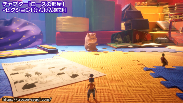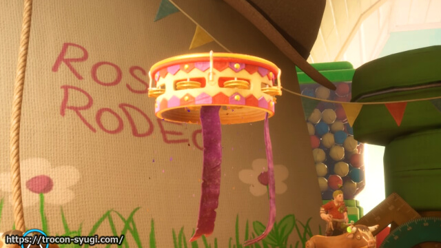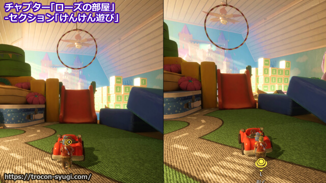 チャプター「ローズの部屋」の「けんけん遊び」で取得可能。セクション開始直後まっすぐ進んだところにある車に一人が乗って、もう一人が後ろに引いて離すことで車が動き出す。車がうまく輪っかの中を通過すればトロフィーを取得できる。