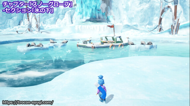 チャプター「スノーグローブ」の「氷の下」で取得可能。セクションを開始してゲートを通った先の大エリアで、水面に浮かんでいるボートの機械で魚を掴んでそれを近くのアザラシにあげればOK。