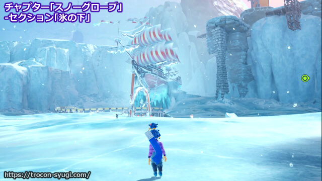 チャプター「スノーグローブ」の「氷の下」で取得可能。セクションを開始してゲートを通った先の大エリアで、氷上に座礁している海賊船の上の宝箱を開いて中に入っている帽子を被ればトロフィー取得。