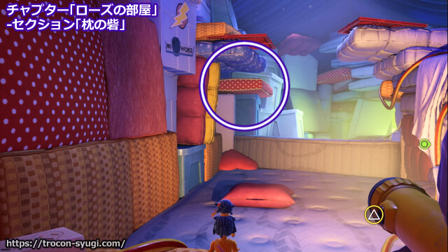 チャプター「ローズの部屋」の「枕の砦」で取得可能。セクションを開始して少し進むと左上側に赤と白の水玉模様のクッションがあり、そこから入った横穴の中の2体の人形のボタンを同時に押すことでイベントが発生してトロフィー取得。