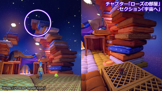 チャプター「ローズの部屋」の「宇宙へ」で取得可能。【遠い周波数】と同じ黄色のポータル内で少し進むとシーソーのようなものがあるので、下がってる方に小さくなったコーディが乗って、反対側でメイがヒップドロップするとトロフィー取得。