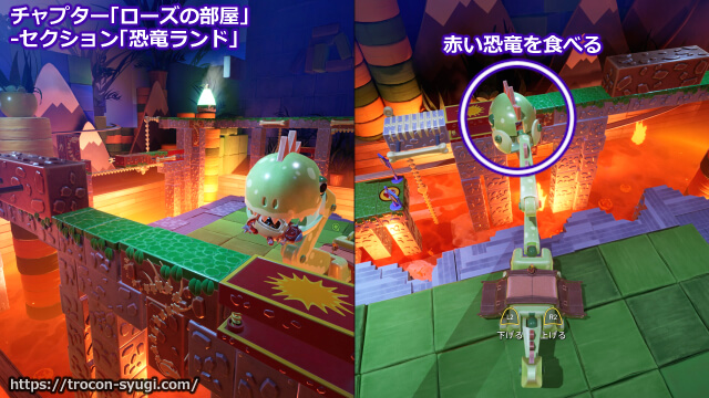 チャプター「ローズの部屋」の「恐竜ランド」で取得可能。両方のプレイヤーが緑と赤の恐竜に乗っているときに、緑の恐竜が△ボタンを押すことで赤の恐竜を食べることができトロフィーを取得できる。