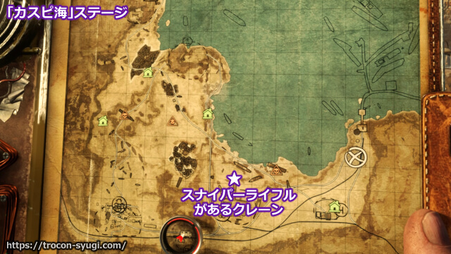 あとはスコープと暗視ゴーグルをつけた状態で、4倍or6倍スコープを取り付けた銃で敵を3体倒せばOK。カスピ海のクレーンの上で入手できるスナイパーライフルは元からスコープがついているので、【近づくな】の取得と一緒にこのトロフィーも狙うのがオススメ。