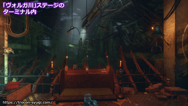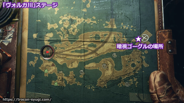 まず「ヴォルガ川」ステージの中央北側にある悪党の拠点で敵を全滅(気絶でもOK・犬は始末)させて檻に捕らわれている人を解放するとターミナルの鍵を入手できる。そのあとトロリー入手のために向かうことになるターミナルで、鍵を使って部屋に入ると机の上に暗視ゴーグルが置かれているので回収。【漁師】でナマズを倒すレバーがある部屋から入れるので鍵はなくても大丈夫かも。