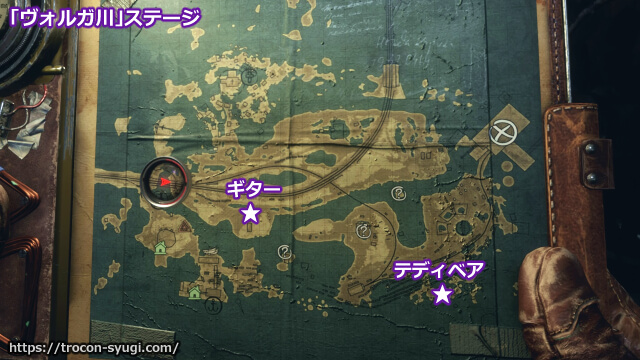 ギターはオーロラ号の停車位置から少し東へ行ったところにある悪党が住み着いている塔の上階に置かれている。テディベアはマップ南東の巨大な石油タンクの最上部にあるが、中央でデーモンが寝ており 【火の鳥】が取得しやすいので一緒に取得してしまうといい。