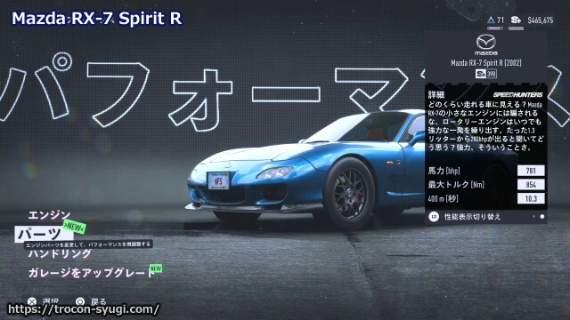 エンジンはスーパー「592馬力3.8L V8エンジン」、パーツは使用できる最高クラスのものを選択。過給器はルーツ式、サスペンションは[ロード]、タイヤは普通のものを使ってました。RX-7以外だとNISSAN 180SX Type Xなどもオススメ。