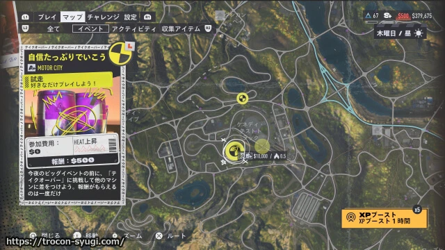 テイクオーバーイベントで250,000点取るにはある程度改造したマシンとプレイスキルが必要なので、この手のイベントが苦手だと数時間ほどのトライ&エラーが必要かも。自分は 【このドリフトを見よ】で紹介したRX-7を使って、昼のMOTOR CITYで発生する試走イベント「自信たっぷりでいこう」で繰り返し練習して取得しました。このイベントは何度でもリスタートできるので、リザルト画面からリスタートを繰り返せば10回クリアトロフィーも取得できる。